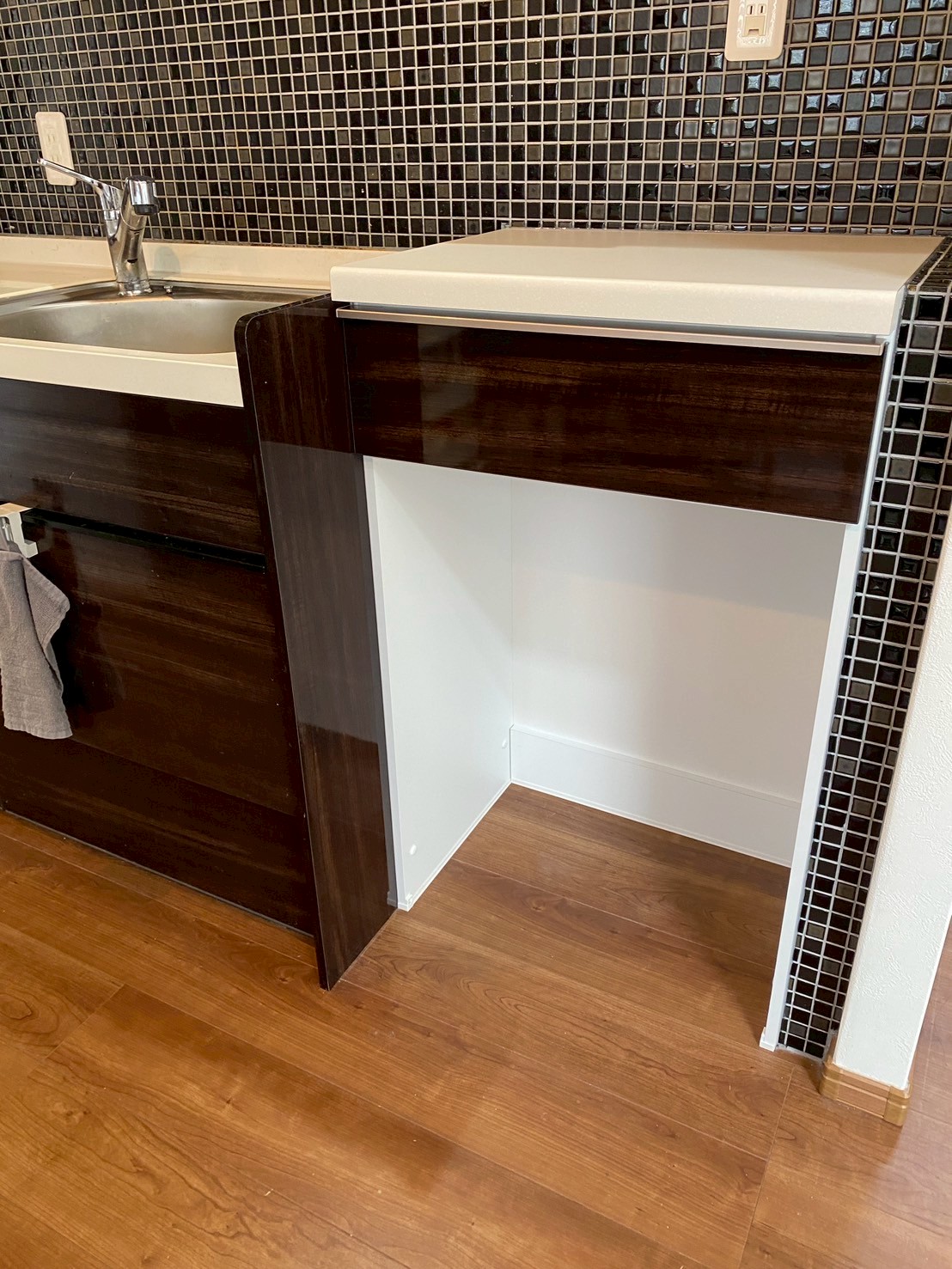 キッチン横のキャビネットにごみ箱を収納できるようにしたいとのご希望で、キャビネットの交換工事をさせていただきました。